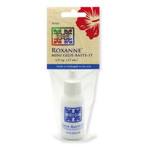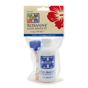 Roxanne Glue-Baste-It is an incredible applique glue that is 100% water soluble, dries in minutes, but holds firmly until you want it loose. The unique syringe applicator allows for the placement of controlled droplets of glue. Does not feel stiff when dry and contains no dyes, waxes or harmful chemicals.