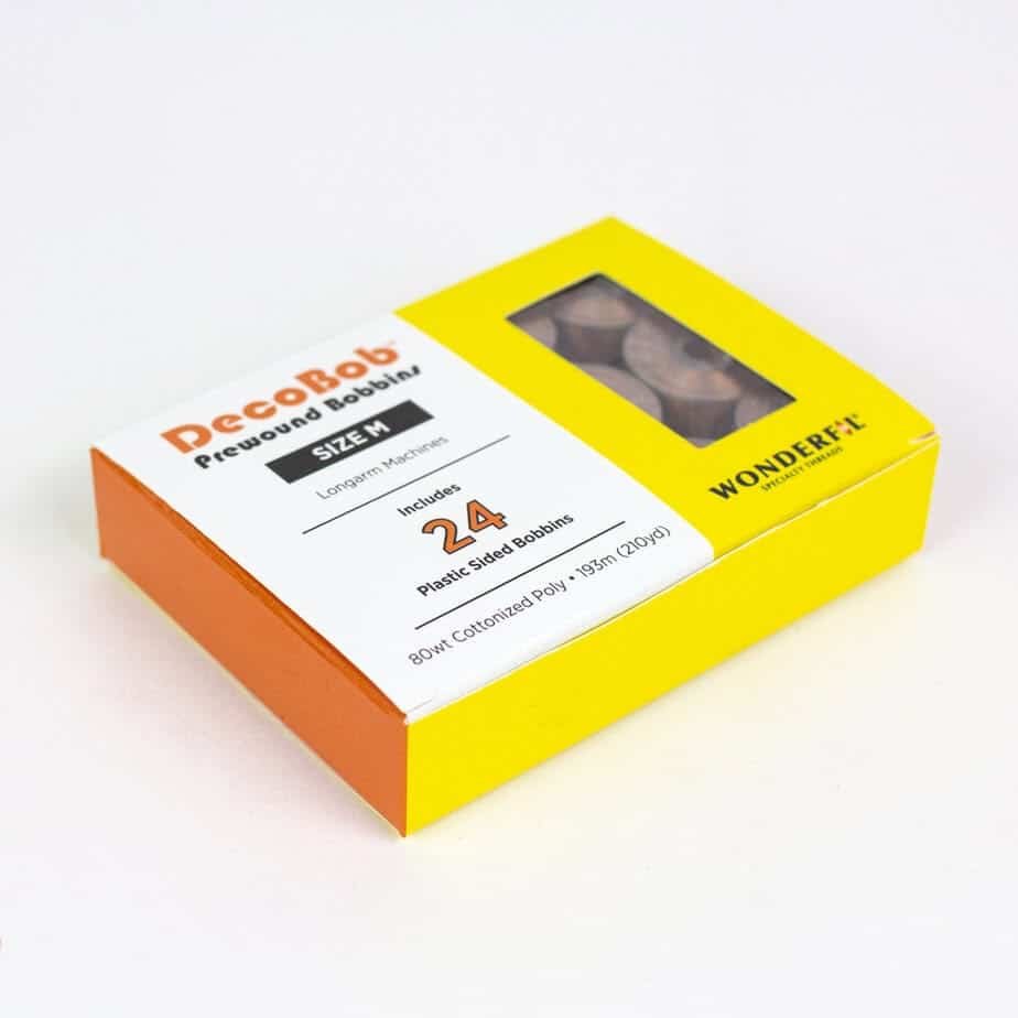 WonderFil pre-wound bobbins are wound with our 80wt DecoBob™ thread in a reusable plastic bobbin, which means there is no glue or wax holding it together (which also makes for happy machines)! DecoBob™ makes for an ideal bobbin thread as using a finer weight thread will also minimize the bulk in whatever you are doing, however, DecoBob™ also has the strength, versatility, and reliability you can count on.